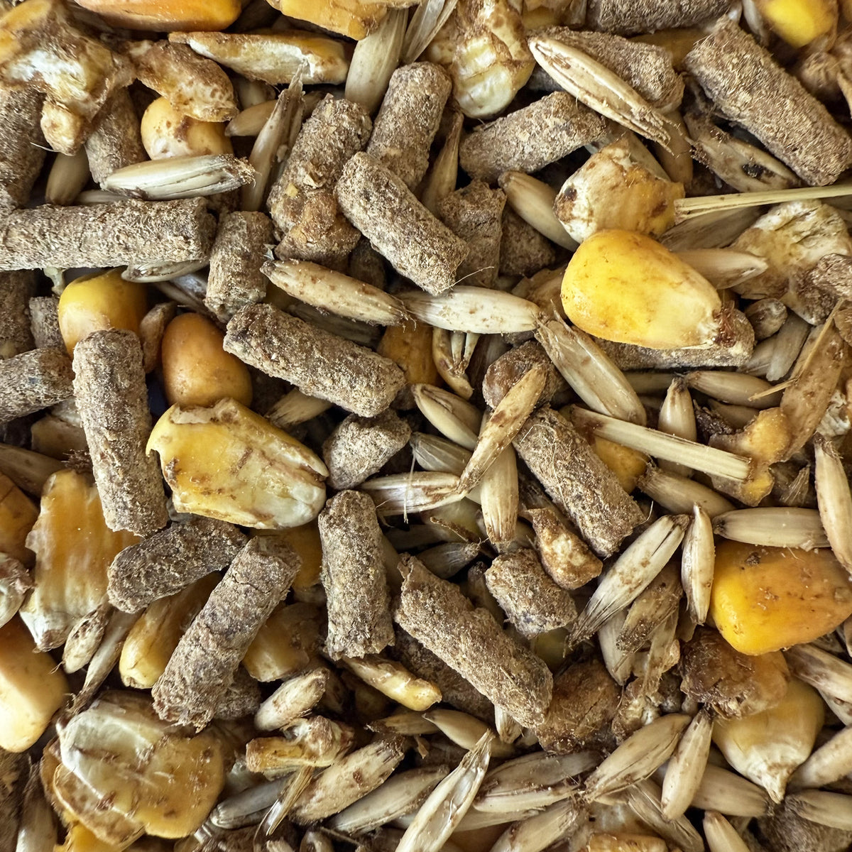 Ingrédients : maïs cassé, avoine, protéines végétales, sources de vitamines et minéraux, vitamines du complexe B, huile végétale, mélasse, saveur
