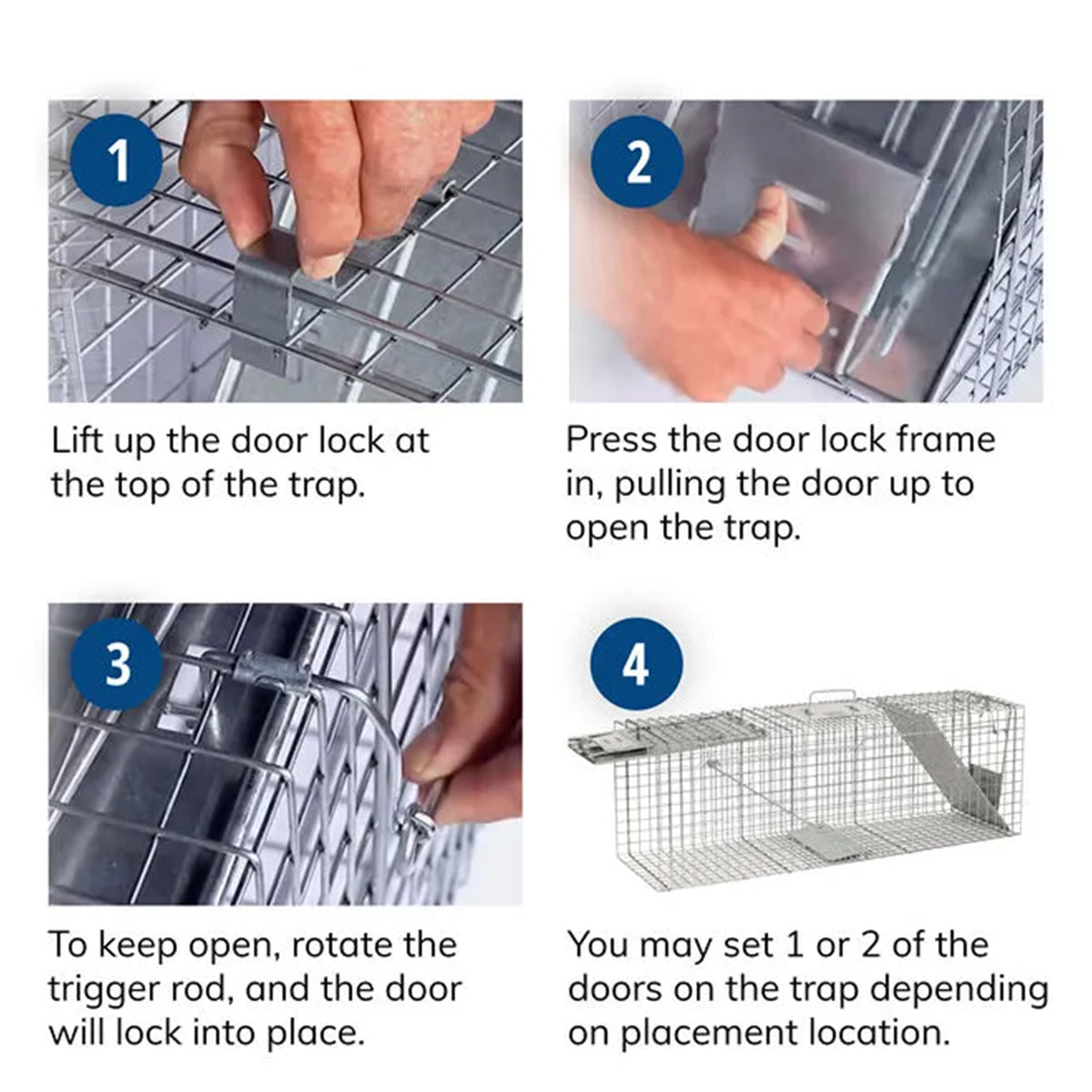 Grâce à ses deux portes à ressorts, l’animal peut entrer par l’une ou l’autre extrémité, augmentant les chances de capture. Les portes solides et la protection de la poignée assurent la sécurité de l’utilisateur lors du transport et de la manipulation. De plus, les bords intérieurs lissés réduisent les risques de blessure pour les animaux capturés, respectant ainsi des pratiques éthiques de capture.